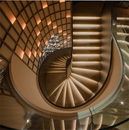 伴随旋转楼梯的流动曲线,木格栅“葡萄枝干”逐渐变成酒窖用于罗列葡萄酒的层架,将自然的生命力与人类的智慧结晶巧妙联动,也蕴含了设计师对于空间及概念的考量。