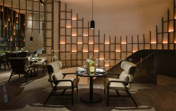 RooMoo通过对空间设计语言的诠释,将葡萄酒的酿制过程以抽象的表达方式融入到餐厅空间之中。选用尺寸各异、角度特别的木造格栅,“爬”在不规则的GRG造型的墙面之上,灵动勾勒出葡萄树的“枝干”,象征葡萄的LED灯“缀”满树枝,生动饱满。