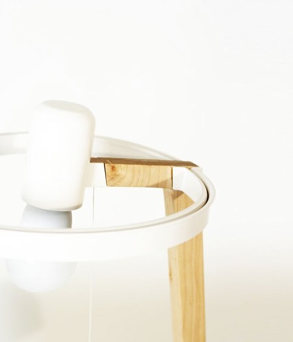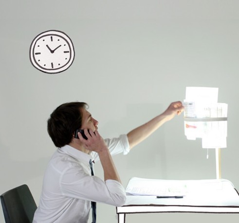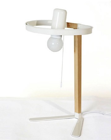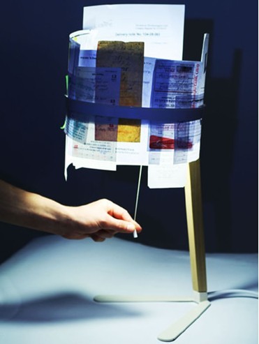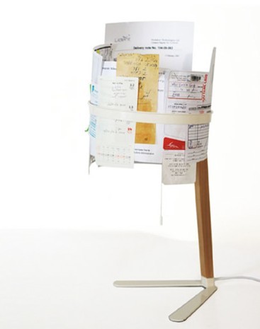 “文件灯”一个没有灯罩的台灯,上层部分的灯有两个圆形的金属圈,金属圈之间的缝用来夹各种文件,如:收据、票据、账单、便签等等,顺便这些文件可以当作台灯的灯罩,抬头可见一目了然。设计:gaby crohn。